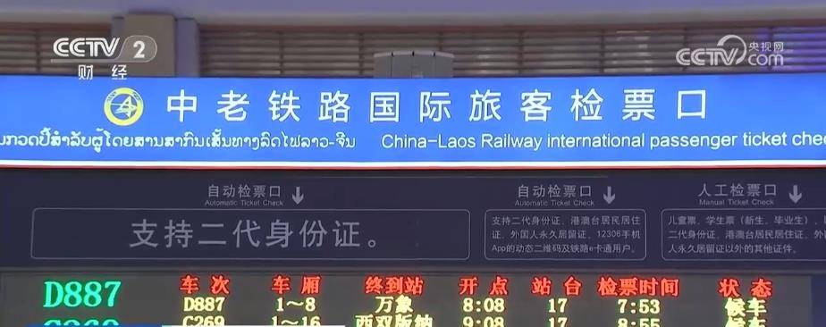 記者 范紫霄:現(xiàn)在是中午12時(shí)30分,這趟列車(chē)已經(jīng)到達(dá)了磨憨站,也是這趟列車(chē)在我國(guó)境內(nèi)的最后一站??缇城巴蠐氲穆每托枰獢y帶全部行李下車(chē)辦理通關(guān)等一些相關(guān)手續(xù),然后繼續(xù)返回這列我們乘坐的D887次列車(chē),通過(guò)畫(huà)面中的友誼隧道,跨越國(guó)境,在今天傍晚6時(shí)38分抵達(dá)老撾首都萬(wàn)象。