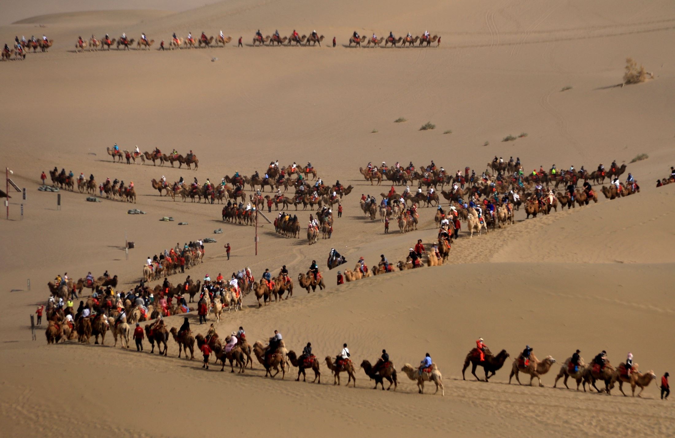 2023年5月1日,甘肅酒泉,敦煌市鳴沙山月牙泉景區(qū),“駱駝紅綠燈”亮起,農(nóng)戶牽著駱駝?dòng)行蛲ㄟ^。
