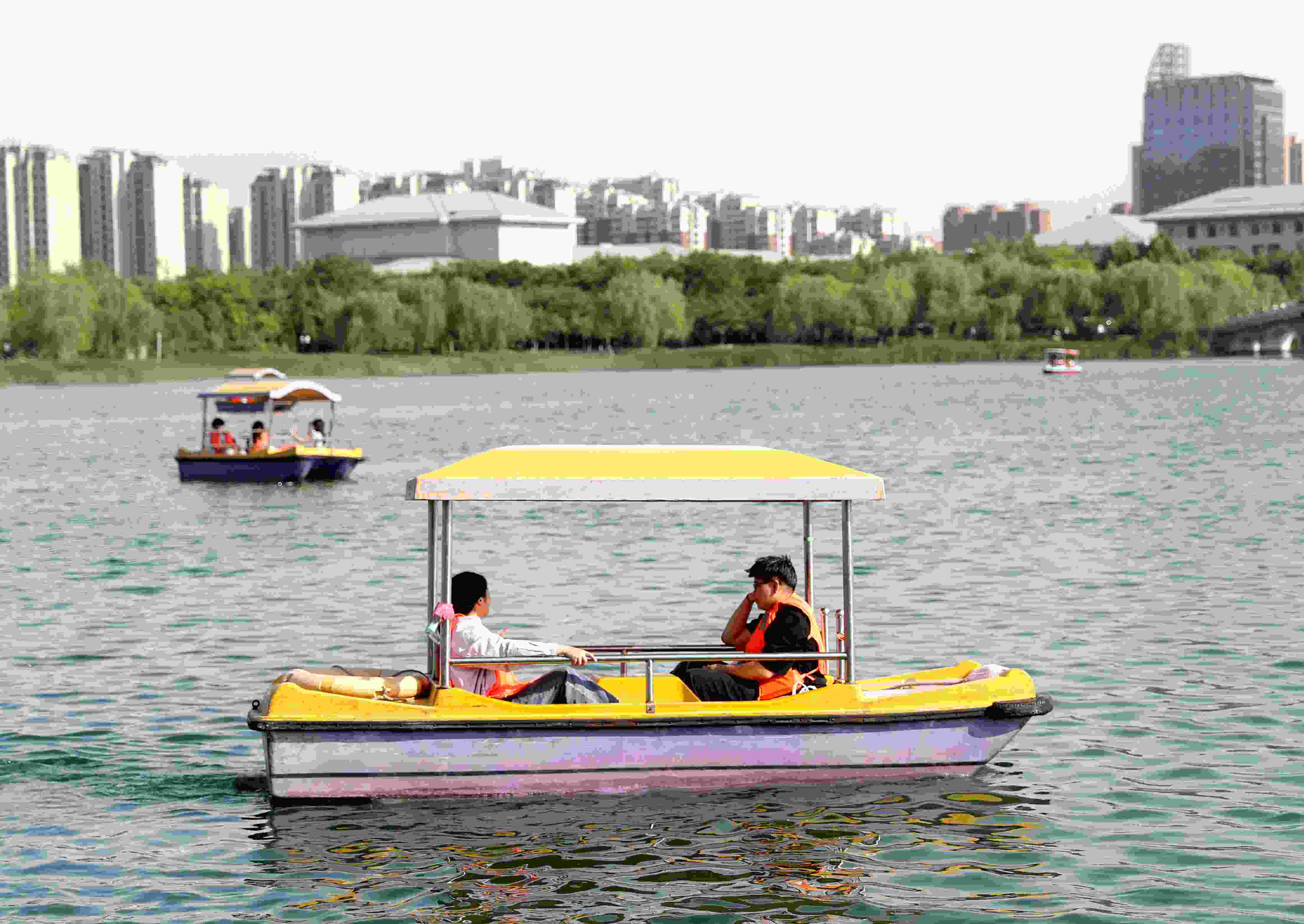 5月2日,游人在山東淄博齊盛湖里泛舟游玩。