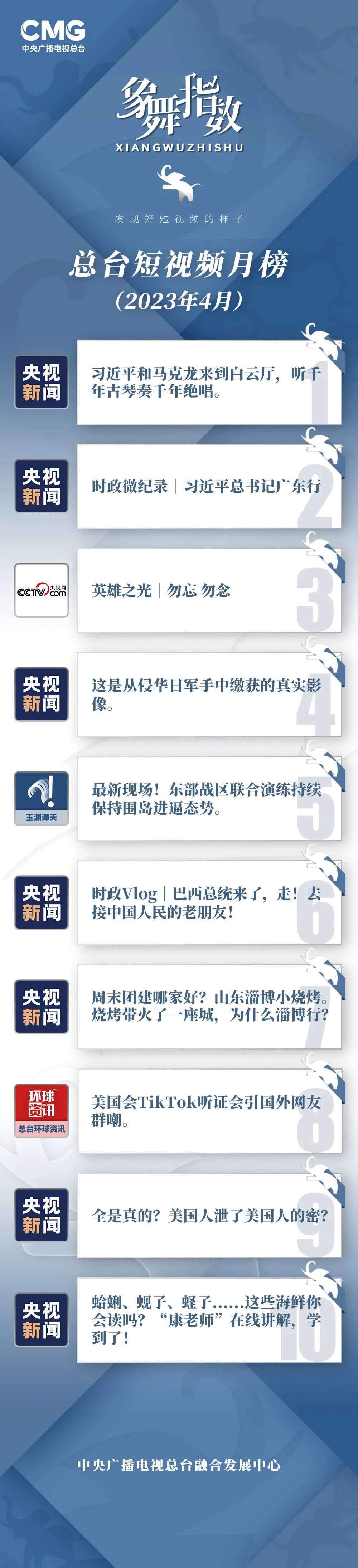 中央廣播電視總臺(tái)“象舞指數(shù)”評(píng)議品牌,推出主流媒體短視頻月榜、總臺(tái)短視頻月榜。在2023年4月,這些內(nèi)容引發(fā)大眾關(guān)注: