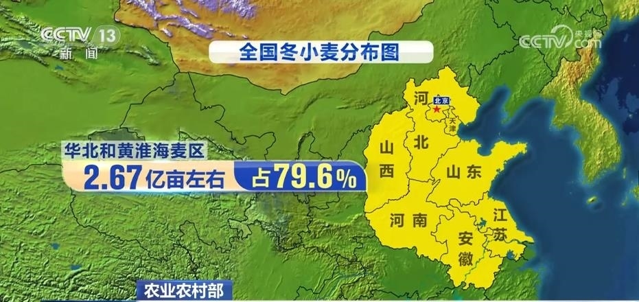 華北和黃淮海麥區(qū)包括北京、天津、河北、山西、江蘇、安徽、山東、河南,冬小麥面積2.67億畝左右,占79.6%。
