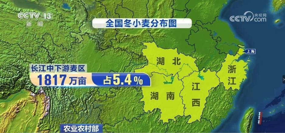 長(zhǎng)江中下游麥區(qū)包括上海、浙江、江西、湖北、湖南,冬小麥面積1817萬(wàn)畝,占5.4%。