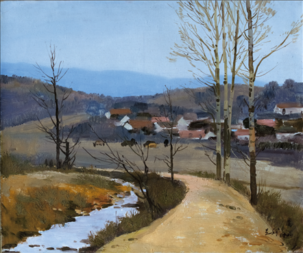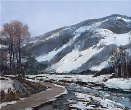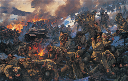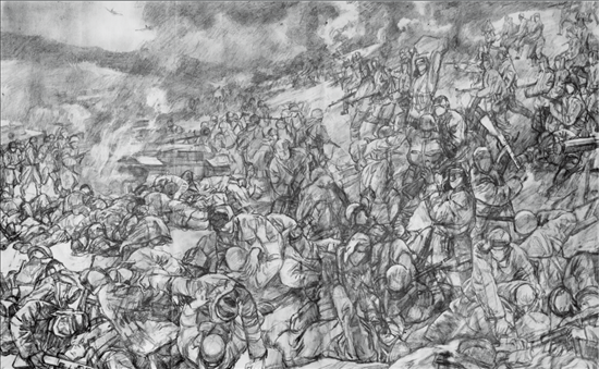 《激戰(zhàn)松骨峰》描繪的是抗美援朝戰(zhàn)爭中,中國人民志愿軍與美軍激烈廝殺的悲壯場面。作者從動態(tài)型的構圖與形象表層,把戰(zhàn)爭集團之間的搏殺以濃重的筆調展現(xiàn)開來,表現(xiàn)了中國人民志愿軍英勇頑強、熱愛自由和勇于犧牲的精神,展示了歷史的悲劇性沖突。作者從沉甸甸的歷史中找到戰(zhàn)爭中最慘烈、最殘酷、最能表現(xiàn)人物悲劇性命運的瞬間,用現(xiàn)實主義的創(chuàng)作手法,扎實、生動地塑造了一個又一個志愿軍勇士的形象。硝煙籠罩著戰(zhàn)場,鮮血與白雪融合成冰,敵我雙方,犬牙交錯,生死搏殺。同時,也使我們感受到戰(zhàn)爭的殘酷與生命的脆弱。作者處理宏大的戰(zhàn)爭場面獨具匠心:陽光透過硝煙,有節(jié)奏地營造出戰(zhàn)場的空間;雪地上被間隔的藍色陰影,反襯出黃褐色的主調。作品對細部進行了恰如其分的刻畫,但又不失對整體宏觀的把握,厚重的色彩中透出熱情,樸拙的筆觸映著畫家的激動。