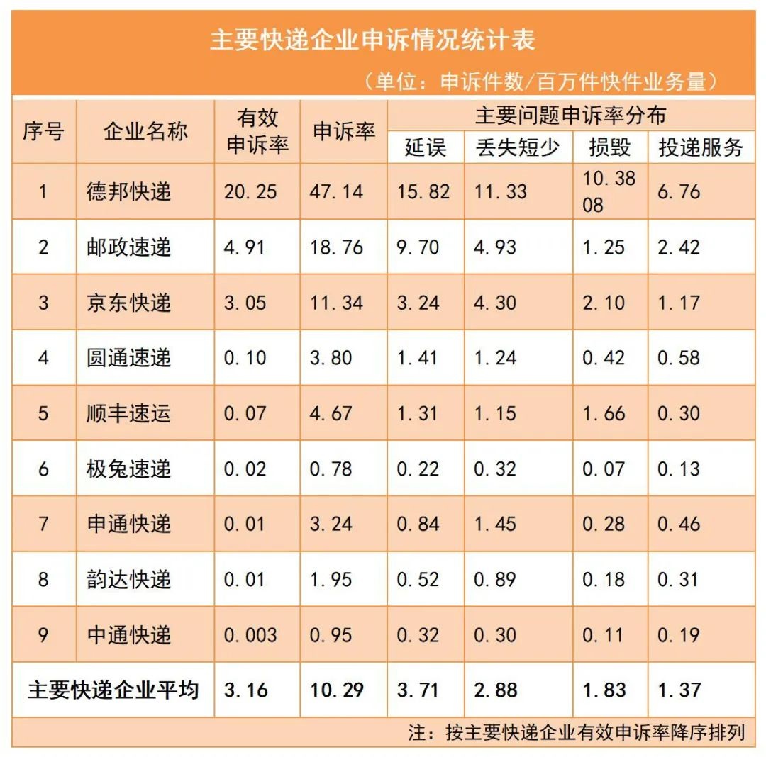 3.主要快遞企業(yè)申訴率情況。主要快遞企業(yè)申訴率(百萬件快件業(yè)務(wù)量)平均為10.29,有效申訴率平均為3.16。用戶對快遞服務(wù)申訴主要問題中,快件延誤申訴率平均為3.71,快件丟失短少申訴率平均為2.88,快件損毀申訴率平均為1.83,投遞服務(wù)申訴率平均為1.37。