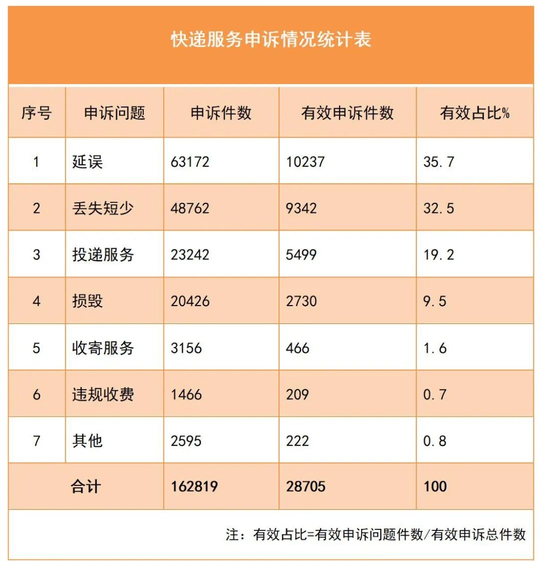 1.快遞服務(wù)申訴問題數(shù)量與類別情況。用戶對快遞服務(wù)問題申訴162819件,其中有效申訴28705件,涉及的主要問題依次是快件延誤、快件丟失短少和投遞服務(wù),分別占有效申訴總量的35.7%、32.5%和19.2%。