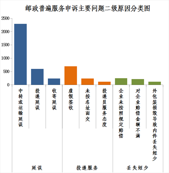 2.郵政普遍服務(wù)申訴主要問題二級原因情況。郵件延誤申訴中主要占比較多的是中轉(zhuǎn)或運(yùn)輸延誤,投遞服務(wù)申訴中主要占比較多的是虛假簽收,郵件丟失短少申訴中主要占比較多的是企業(yè)未按照規(guī)定賠償。