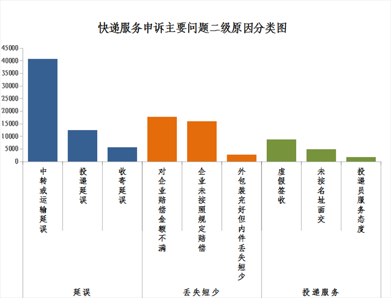 2.快遞服務(wù)申訴主要問題二級原因情況。快件延誤申訴中主要占比較多的是中轉(zhuǎn)或運(yùn)輸延誤,快件丟失短少申訴中主要占比較多的是對企業(yè)賠償金額不滿,投遞服務(wù)申訴中主要占比較多的是虛假簽收。