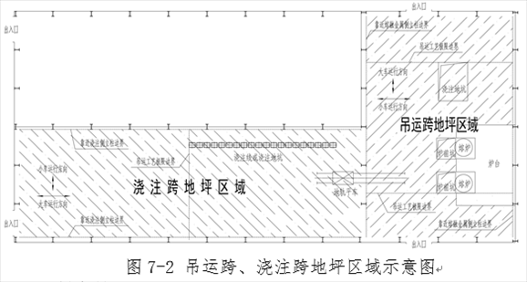 注:“正下方地坪區(qū)域”是指橫向以吊運(yùn)跨兩側(cè)立柱靠近熔融金屬吊運(yùn)側(cè)的立柱邊線(xiàn)為界,縱向以吊運(yùn)跨最兩端的鐵水、鋼水、液渣吊運(yùn)工藝極限邊界為界的車(chē)間地坪區(qū)域(圖4-2)。