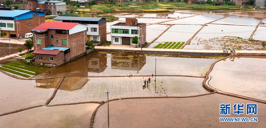 初夏時(shí)節(jié),廟宇鎮(zhèn)農(nóng)戶在農(nóng)田里插秧忙。新華網(wǎng)發(fā)(朱云平 攝)