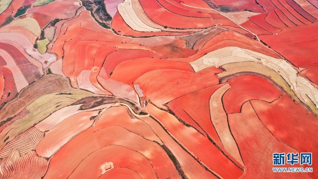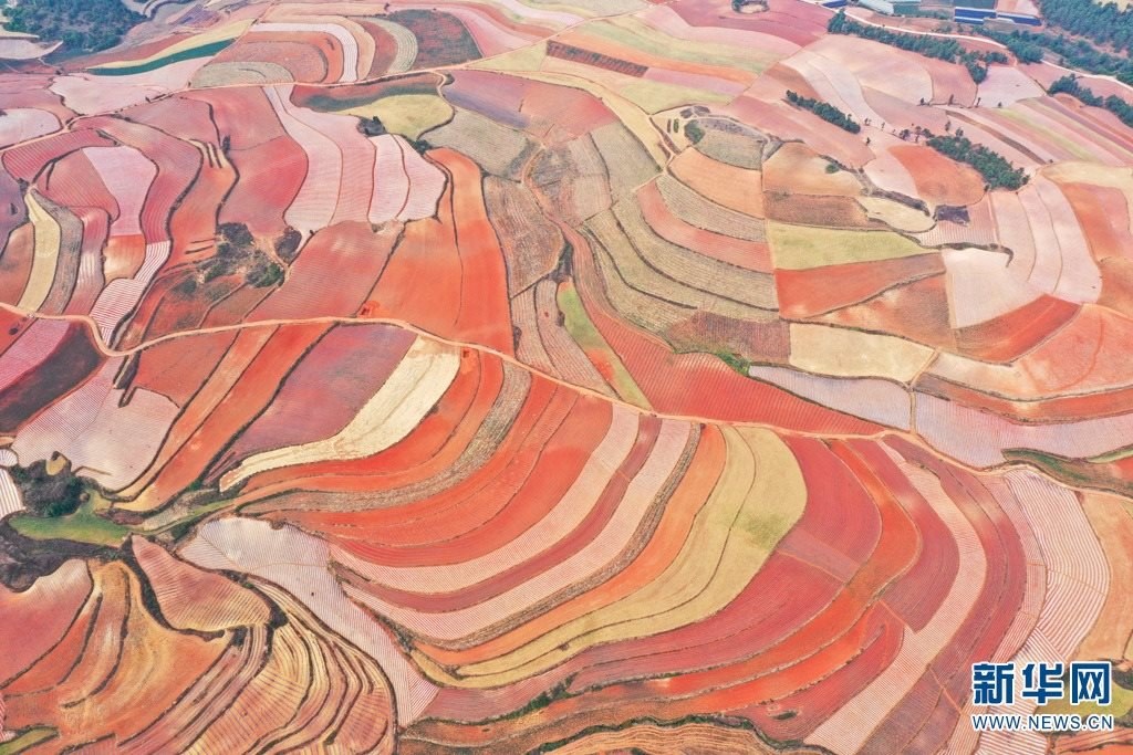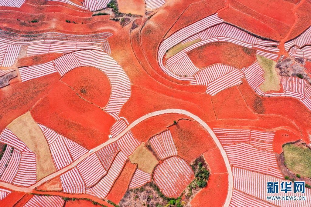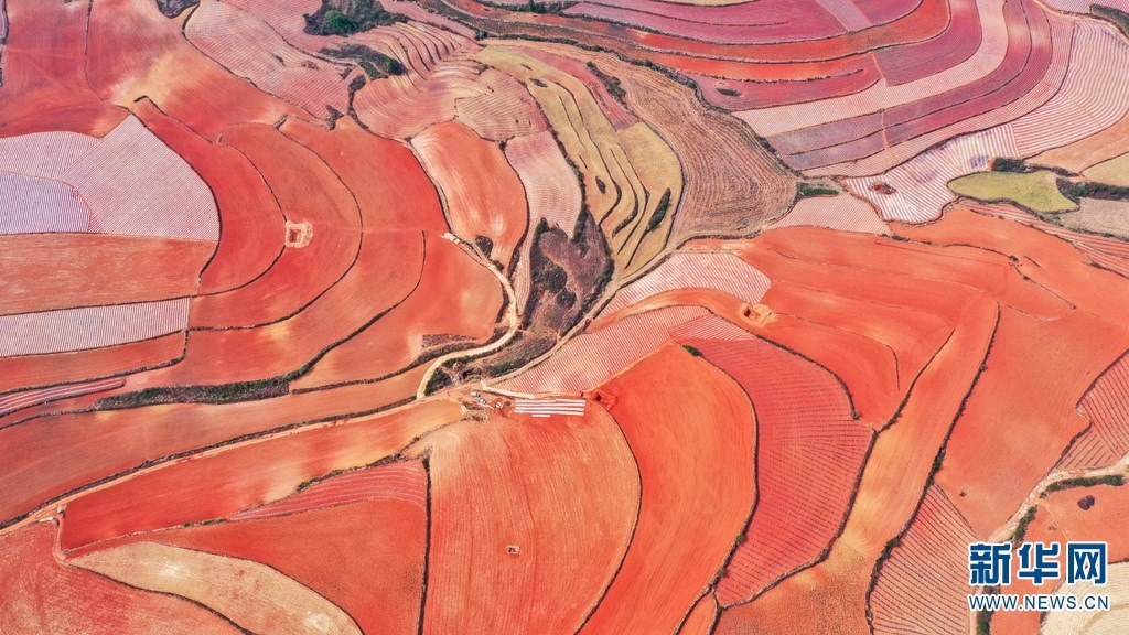 云南省尋甸回族彝族自治縣,連綿不斷的旱梯田遍布山間,遠接天邊,每年4-5月,經過村民翻新、平整后的紅褐色土地,從空中俯瞰五彩斑斕、蔚為壯觀。當?shù)卮迕裥燎诟旁诜饰值募t土地上,用勤勞的雙手,繪就一幅幅勞動藝術畫作。新華網(wǎng)發(fā)(孫文來 攝影報道)