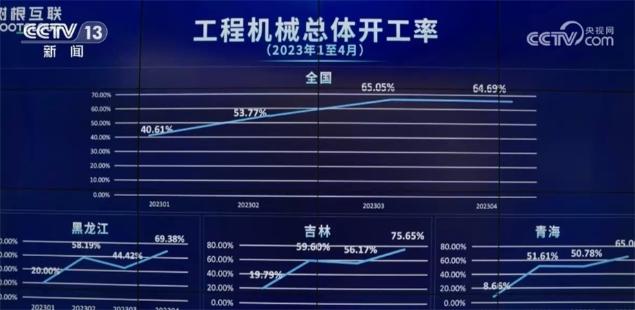 這個大屏幕反映的是全國挖掘機(jī)的開工情況,相關(guān)負(fù)責(zé)人告訴記者,“挖掘機(jī)指數(shù)”顯示出今年我國工程機(jī)械行業(yè)開始出現(xiàn)回暖跡象。4月份,全國工程機(jī)械總體開工率為64.69%,環(huán)比3月基本持平。12個省(區(qū)、市)創(chuàng)下今年以來最好成績。