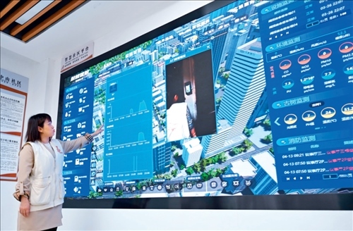 福建省福州市鼓樓區(qū)是國(guó)家智能社會(huì)治理綜合實(shí)驗(yàn)基地,社區(qū)工作者在鼓樓區(qū)鼓東街道中山社區(qū)介紹“智慧社區(qū)”建設(shè)情況(2023年 4 月 25 日攝) 林善傳攝 / 本刊