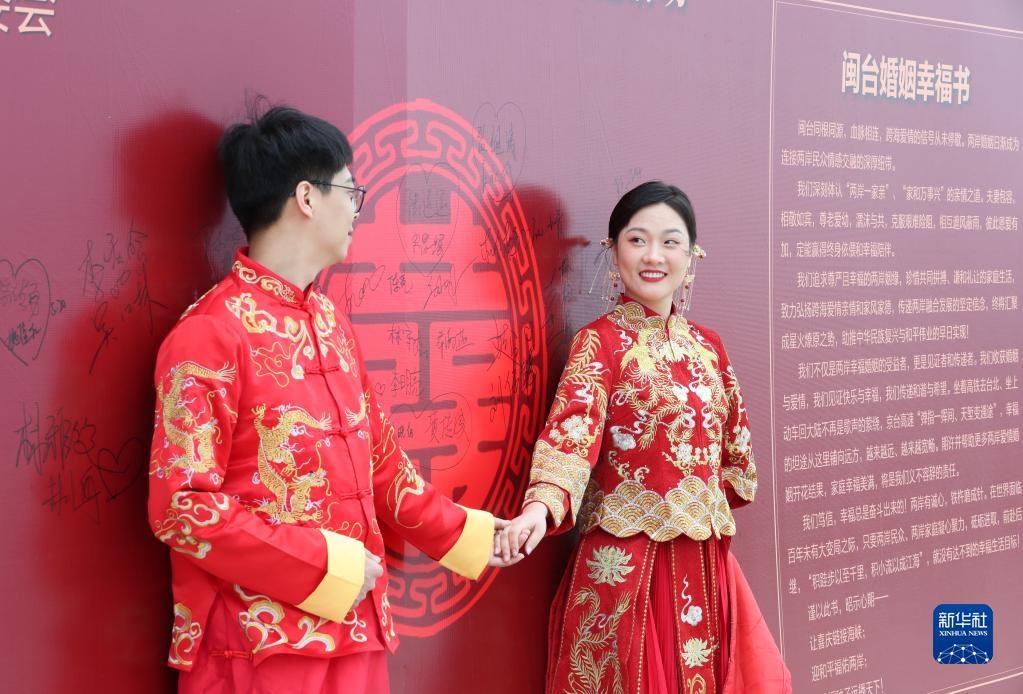 當(dāng)日,一場(chǎng)以“愛情恒久遠(yuǎn)、幸福長相伴”為主題的閩臺(tái)“山盟海誓”集體婚禮暨2023年閩臺(tái)婚姻家庭交流活動(dòng)在福建省福州市平潭縣舉辦。21對(duì)閩臺(tái)新人身穿紅色中式婚服,手牽紅繡球,行跨火盆、踩瓦片、扎繡球和“合茶”、“合巹”、“海誓”等閩臺(tái)傳統(tǒng)結(jié)婚禮儀,結(jié)下跨越海峽的姻緣。