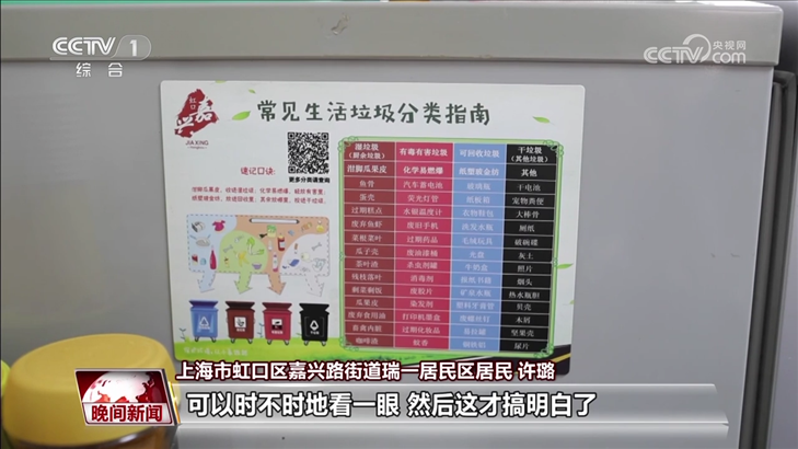 上海市虹口區(qū)嘉興路街道瑞一居民區(qū)居民 許璐:剛開始我們也搞不明白什么算是濕垃圾,什么算是干垃圾,然后看了小冊子,看了一些廣告,看還有冰箱貼,天天貼著那個(gè)上頭,可以時(shí)不時(shí)地看一眼,然后這才搞明白了。