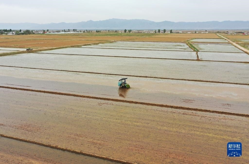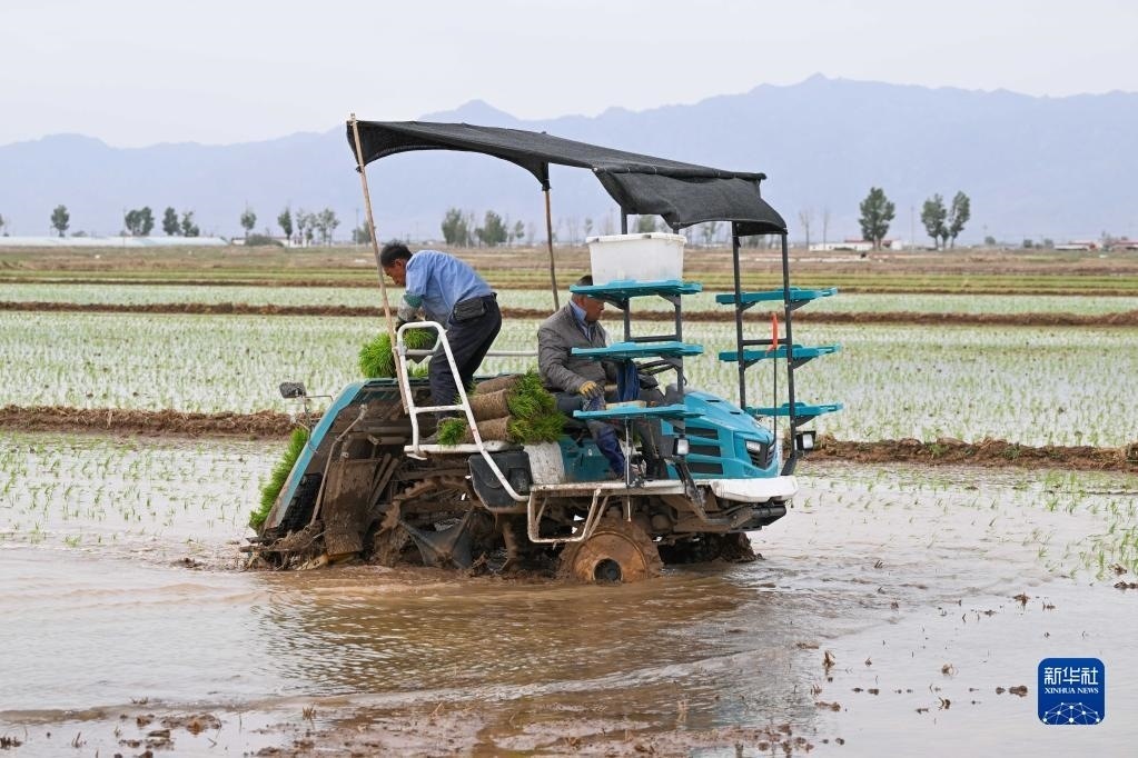 5月23日,達拉特旗昭君鎮(zhèn)村民在鹽堿地改良水稻田中使用農機插秧。