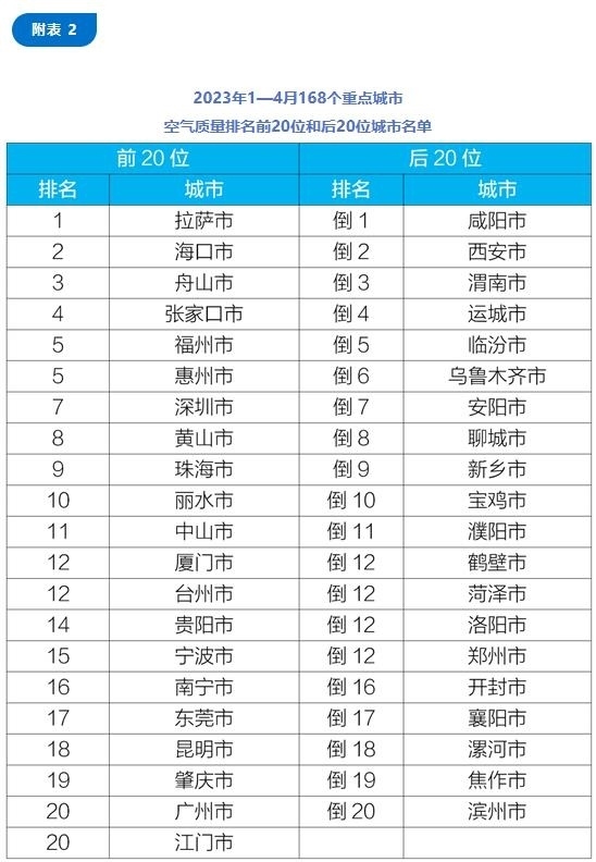 1—4月,168個(gè)重點(diǎn)城市中,拉薩、??诤椭凵降瘸鞘锌諝赓|(zhì)量相對(duì)較好(從第1名至并列第20名);咸陽(yáng)、西安和渭南等城市空氣質(zhì)量相對(duì)較差(從倒數(shù)第1名至倒數(shù)第20名)。