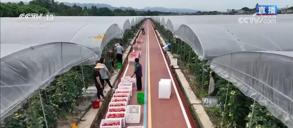 我身后就是一大片番茄種植棚,整齊栽種行距方便管理與采摘,噴灌、滴灌設(shè)備能讓番茄更加水潤多汁,而且番茄植株在生長的過程中,也形成了果實(shí)漸次成熟的立體梯度,讓整個(gè)采摘季能達(dá)到一個(gè)多月。這一片設(shè)施農(nóng)業(yè),一天產(chǎn)出的番茄總量達(dá)到了兩三萬斤,不僅服務(wù)了成渝雙城經(jīng)濟(jì)圈,據(jù)說五月份最遠(yuǎn)的一份訂單是供應(yīng)大灣區(qū)的。說到設(shè)施農(nóng)業(yè),除了設(shè)施變得更科學(xué)、更智慧之外,現(xiàn)在的訂單農(nóng)業(yè)也在幫助農(nóng)民獲得更準(zhǔn)確的銷售網(wǎng)絡(luò)。