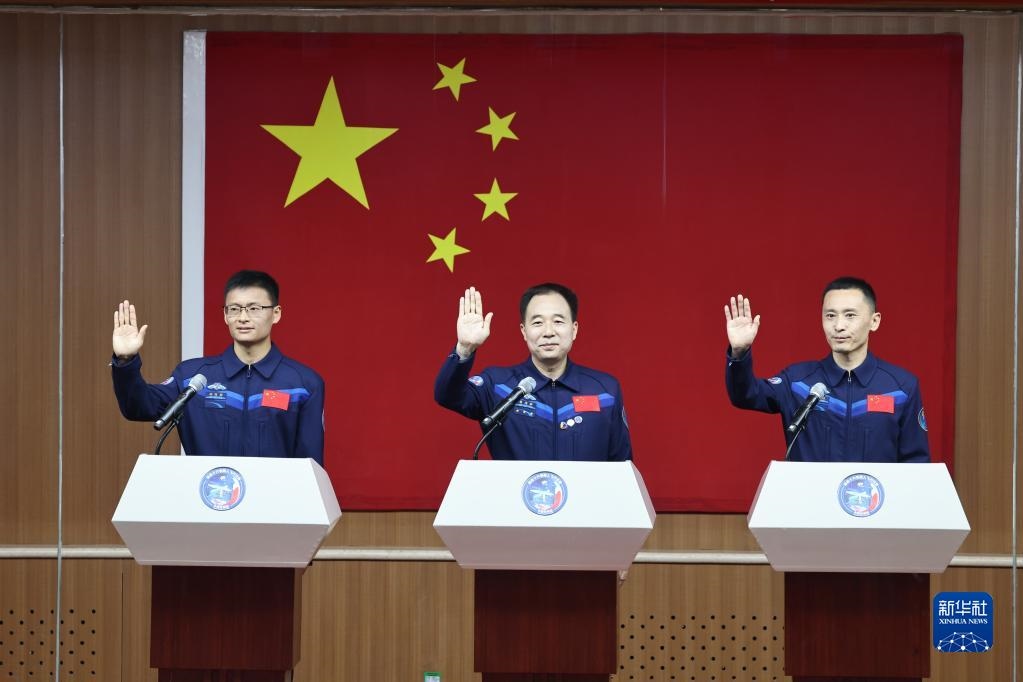 5月29日,神舟十六號航天員乘組與中外媒體記者集體見面會在酒泉衛(wèi)星發(fā)射中心問天閣舉行。這是指令長景海鵬(中)、航天飛行工程師朱楊柱(右)、載荷專家桂海潮回答記者提問。