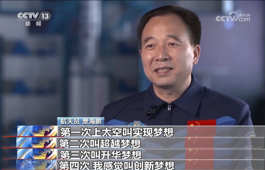 航天員 景海鵬:第一次上太空叫實(shí)現(xiàn)夢(mèng)想,第二次叫超越夢(mèng)想,第三次叫升華夢(mèng)想,第四次,我感覺(jué)叫創(chuàng)新夢(mèng)想。很感恩新時(shí)代,剛才說(shuō)如果沒(méi)有這個(gè)偉大新時(shí)代,就不會(huì)有載人航天的連戰(zhàn)連捷;如果沒(méi)有這個(gè)偉大新時(shí)代,還夢(mèng)想飛兩次飛三次飛四次,你想都不敢想,夢(mèng)都?jí)舨坏健?