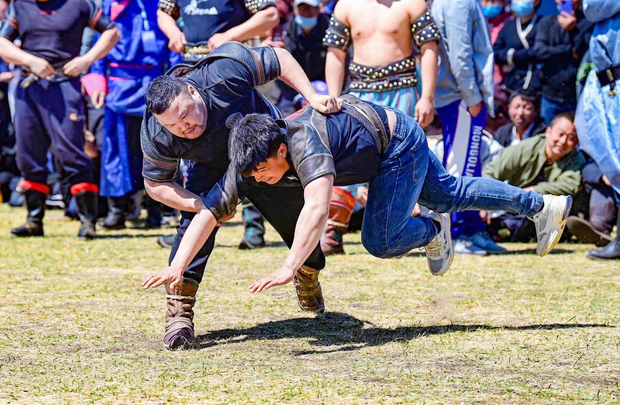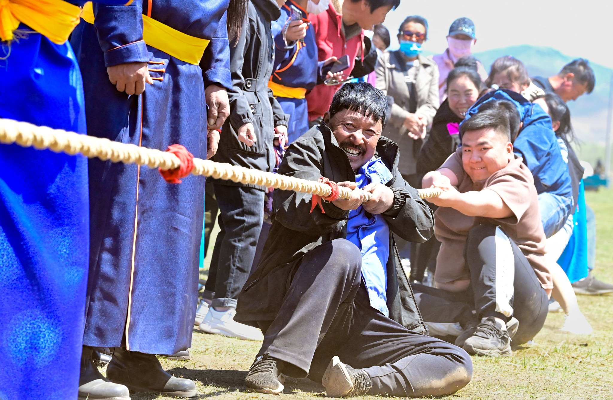 2023年5月26日,內(nèi)蒙古興安盟,科爾沁右翼前旗德伯斯鎮(zhèn)阿日林一合嘎查舉行首屆那達(dá)慕,設(shè)置的賽馬、布魯、搏克、拔河等傳統(tǒng)體育娛樂項目,吸引嘎查周邊500余名牧民參加比賽,喜慶牧業(yè)豐收季。視覺中國