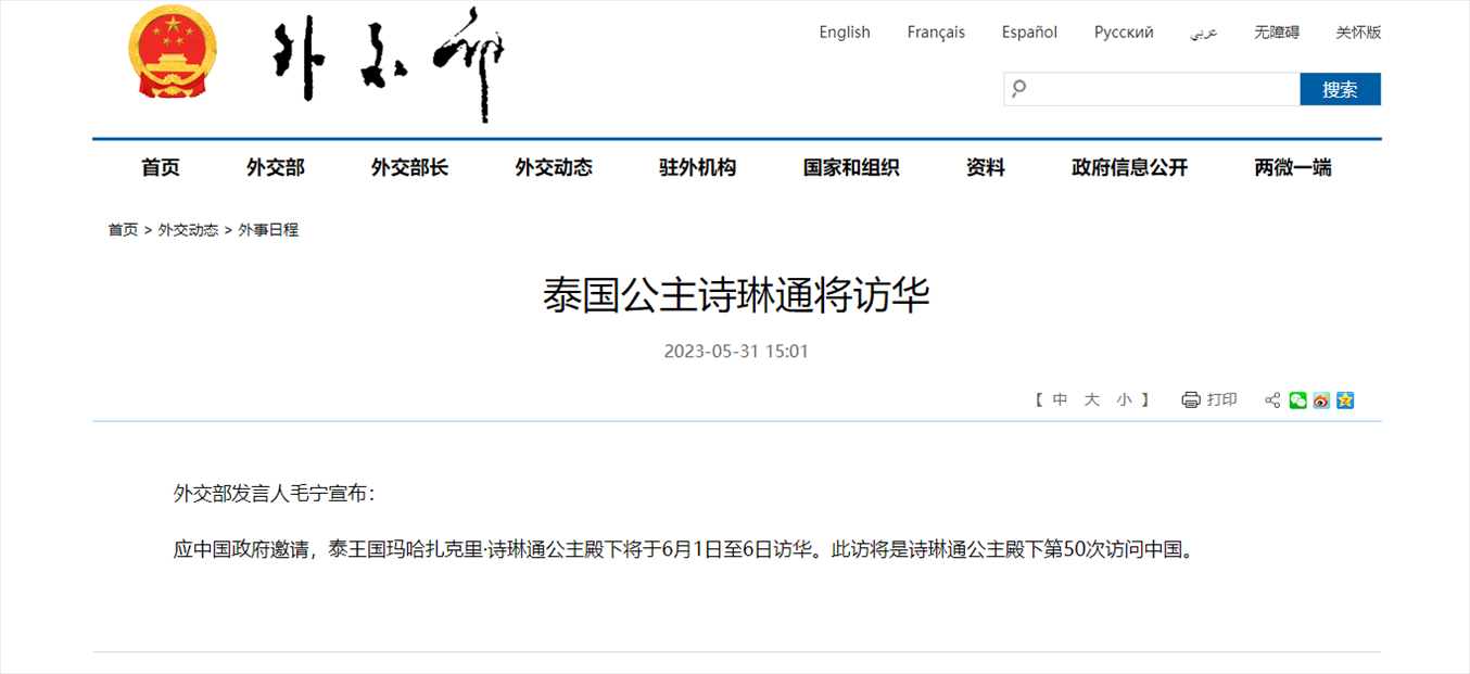 外交部發(fā)言人毛寧宣布:應(yīng)中國政府邀請,泰王國瑪哈扎克里·詩琳通公主殿下將于6月1日至6日訪華。此訪將是詩琳通公主殿下第50次訪問中國。