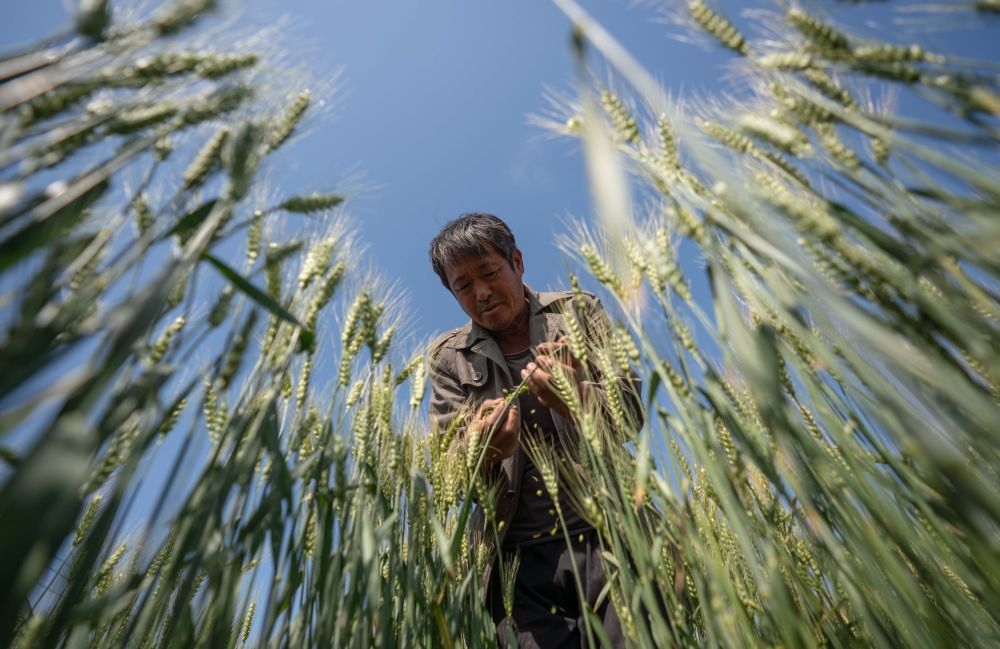 5月19日,在山東省東營(yíng)市黃河三角洲農(nóng)業(yè)高新技術(shù)產(chǎn)業(yè)示范區(qū),農(nóng)科人員在觀(guān)察“濟(jì)麥60”的生長(zhǎng)情況。新華社記者 徐速繪 攝