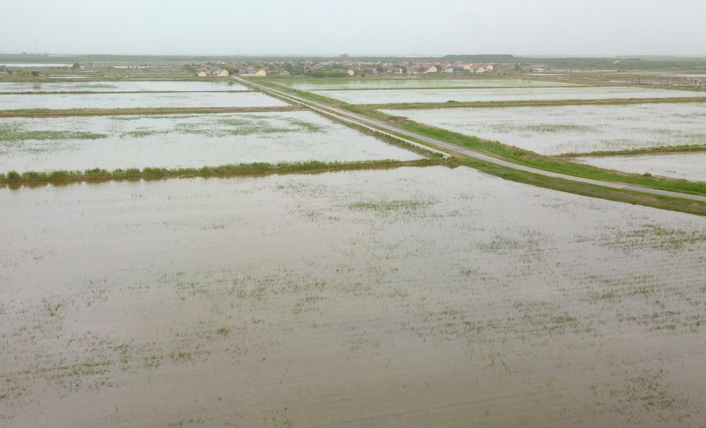 5月20日,山東省東營(yíng)市墾利區(qū)黃河口鎮(zhèn),鹽堿地改良的田地上已播種海水稻秧苗(無(wú)人機(jī)照片)。新華社記者 徐速繪 攝