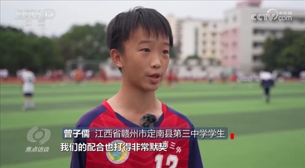 江西省贛州市定南縣第三中學學生曾子儒:“踢足球之前自己體弱多病,身體素質(zhì)比較差,別提去踢這么一場激烈的足球比賽,就是讓我圍著操場跑一圈都氣喘吁吁?!?br>