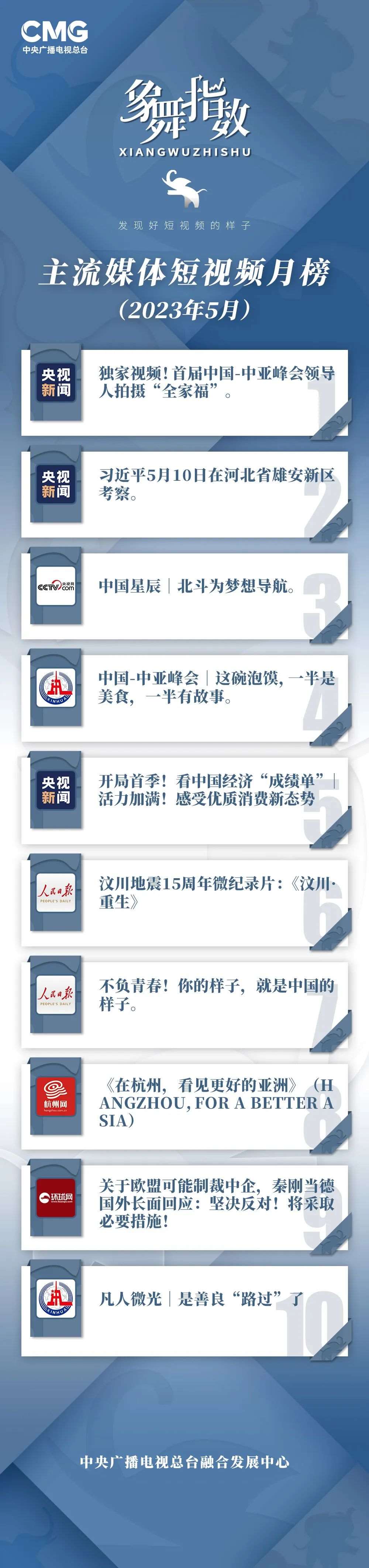 中央廣播電視總臺(tái)“象舞指數(shù)”評(píng)議品牌,推出主流媒體短視頻月榜、總臺(tái)短視頻月榜。在2023年5月,這些內(nèi)容引發(fā)大眾關(guān)注: