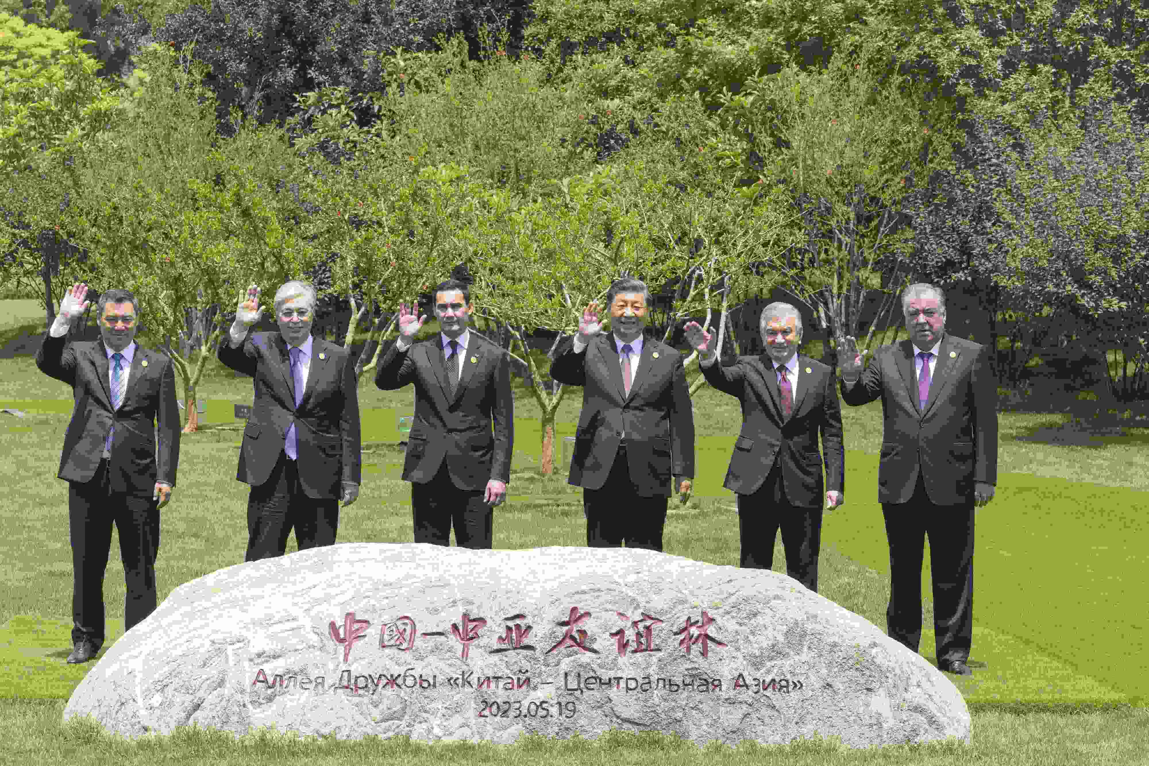 △5月19日上午,習(xí)近平主席在陜西省西安市主持首屆中國-中亞峰會并發(fā)表主旨講話。峰會結(jié)束后,習(xí)近平和中亞五國元首共同種下六棵石榴樹。