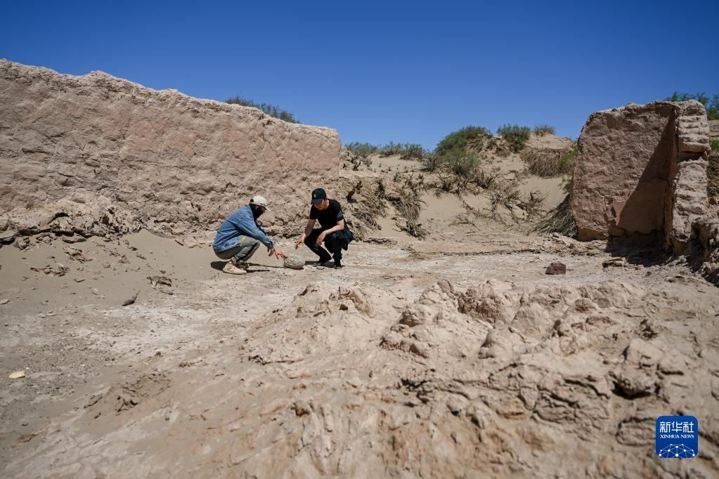 6月2日,額濟納旗文物保護中心工作人員拍攝紅廟遺址坍塌情況。