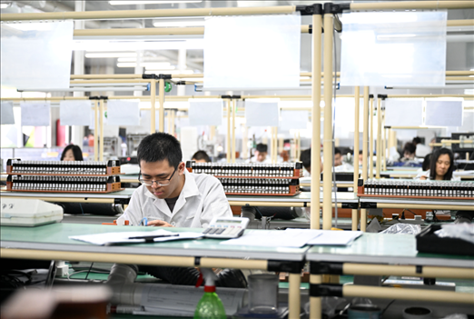 工作人員在天津宜科自動(dòng)化股份有限公司傳感器生產(chǎn)車間內(nèi)工作。新華社記者 趙子碩 攝