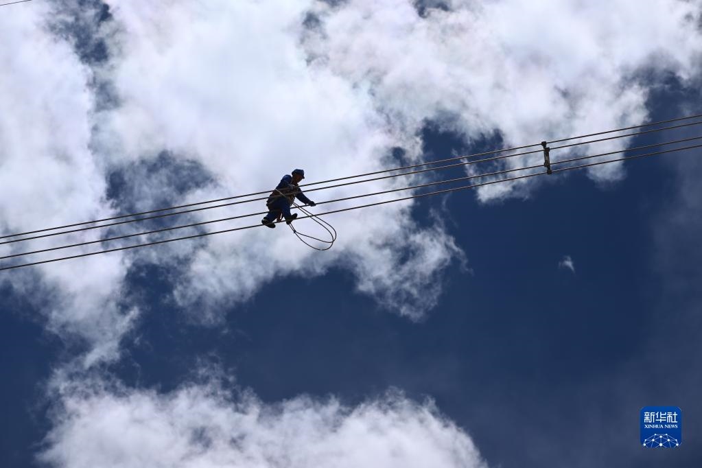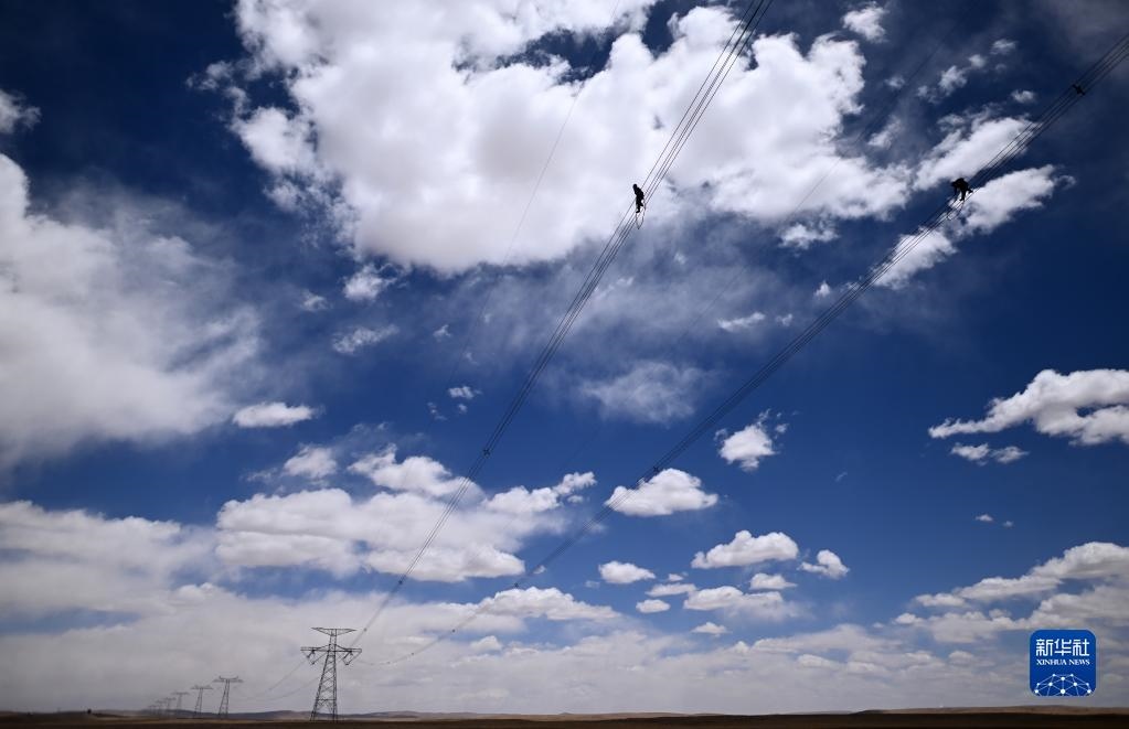 在青海省海西蒙古族藏族自治州格爾木市唐古拉山鎮(zhèn)境內(nèi),檢修人員在走線(xiàn)巡檢中(6月3日攝)。