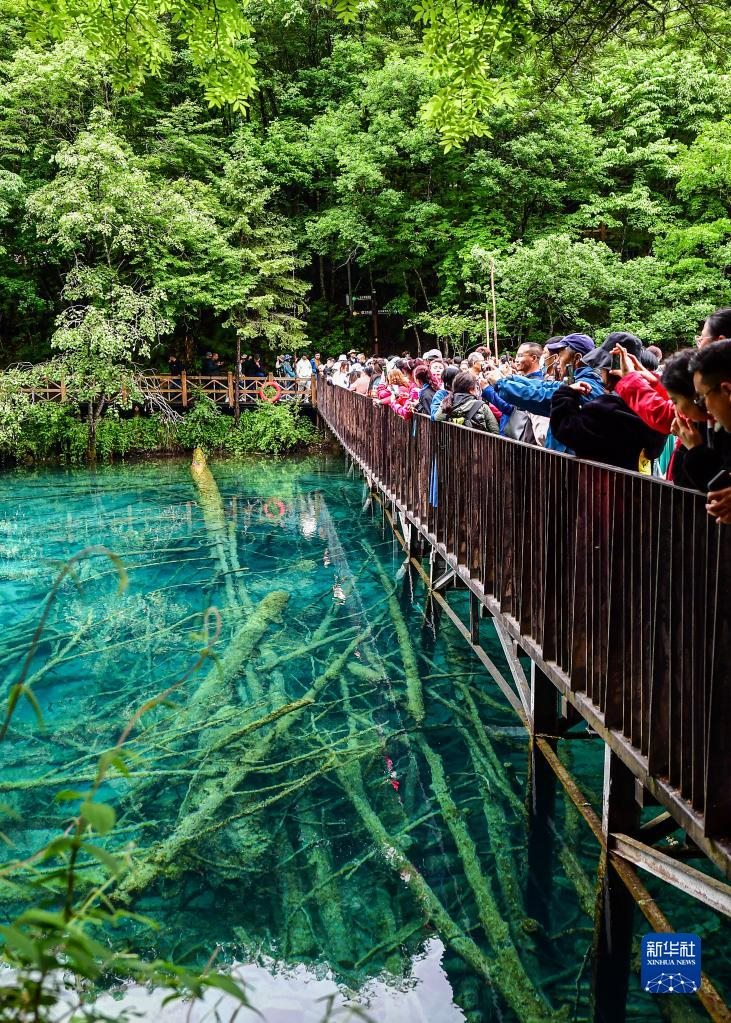 九寨溝景區(qū)五花海景點人流如織(6月7日攝)。