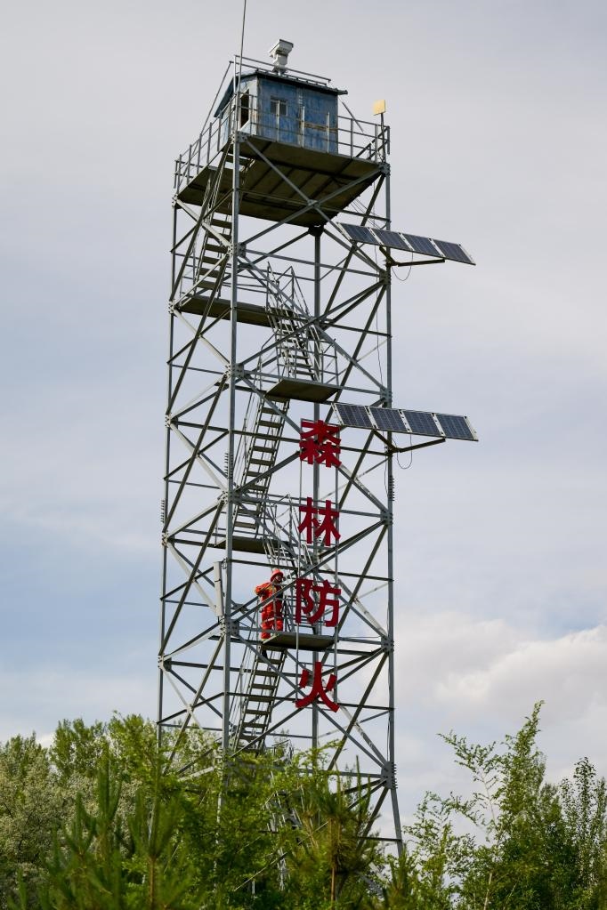 6月5日,臨河區(qū)國(guó)營(yíng)新華林場(chǎng)護(hù)林員登上瞭望塔準(zhǔn)備開(kāi)展巡護(hù)工作。新華社記者 李志鵬 攝