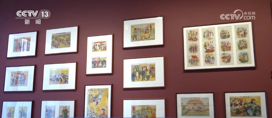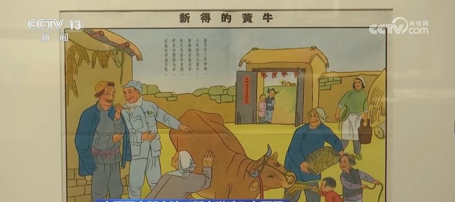 跟隨著講解員,再往前走,國家版本館的特色館藏——年畫、連環(huán)畫和宣傳畫出現(xiàn)在眼前。這面墻上和展柜集中展出了47幅新中國成立初期的新年畫。畫家李可染在1950年創(chuàng)作的《新得的黃?!返茸髌罚宫F(xiàn)出老百姓感受到新中國新生活的幸福和美好。