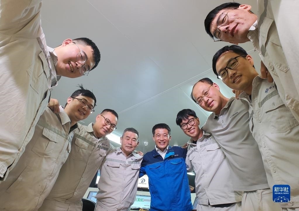 6月11日,在深中通道海底隧道管節(jié)最終接頭合龍后,中交一航局深中項(xiàng)目測(cè)管中心負(fù)責(zé)人鎖旭宏(中)和團(tuán)隊(duì)成員一起慶賀。   新華社發(fā)