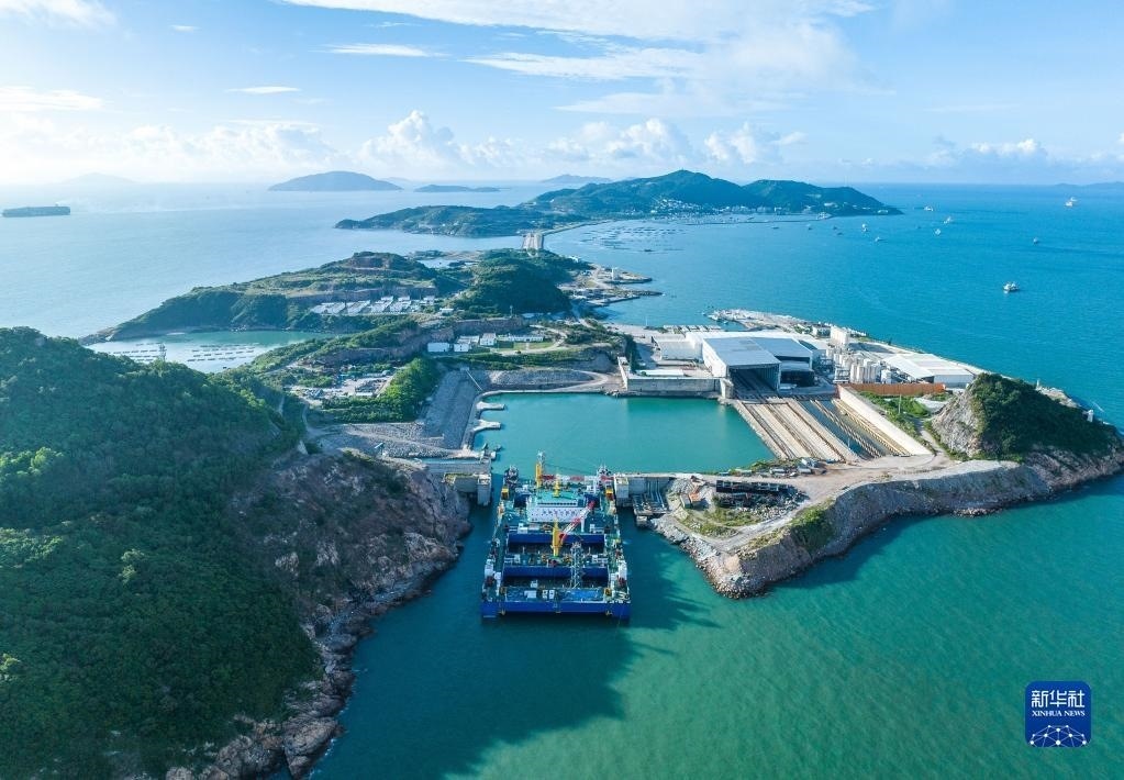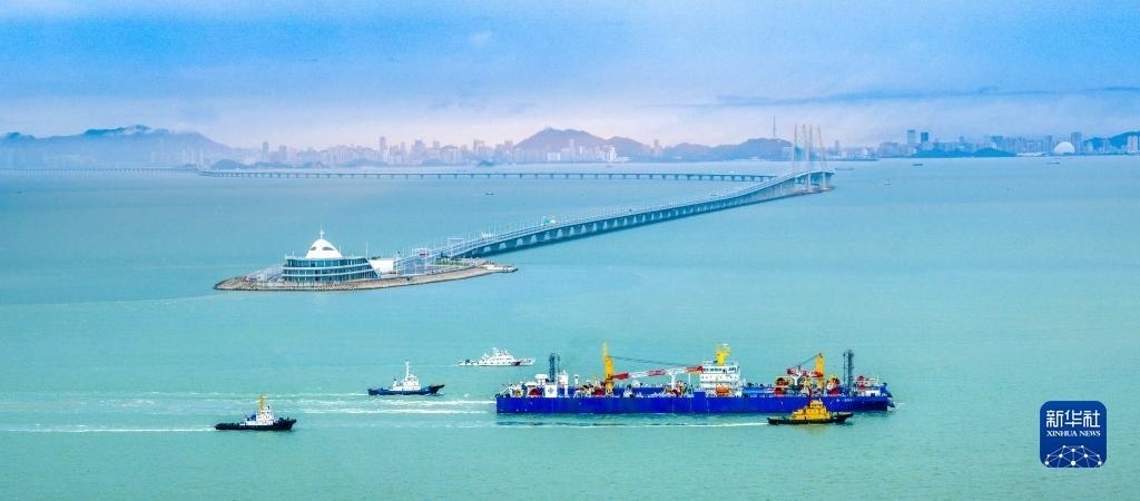 “一航津安1”號(hào)沉管運(yùn)輸安裝一體船拖帶E23管節(jié)和最終接頭從珠海桂山島啟航,前往沉放水域(6月8日攝,無人機(jī)照片)。   新華社發(fā)