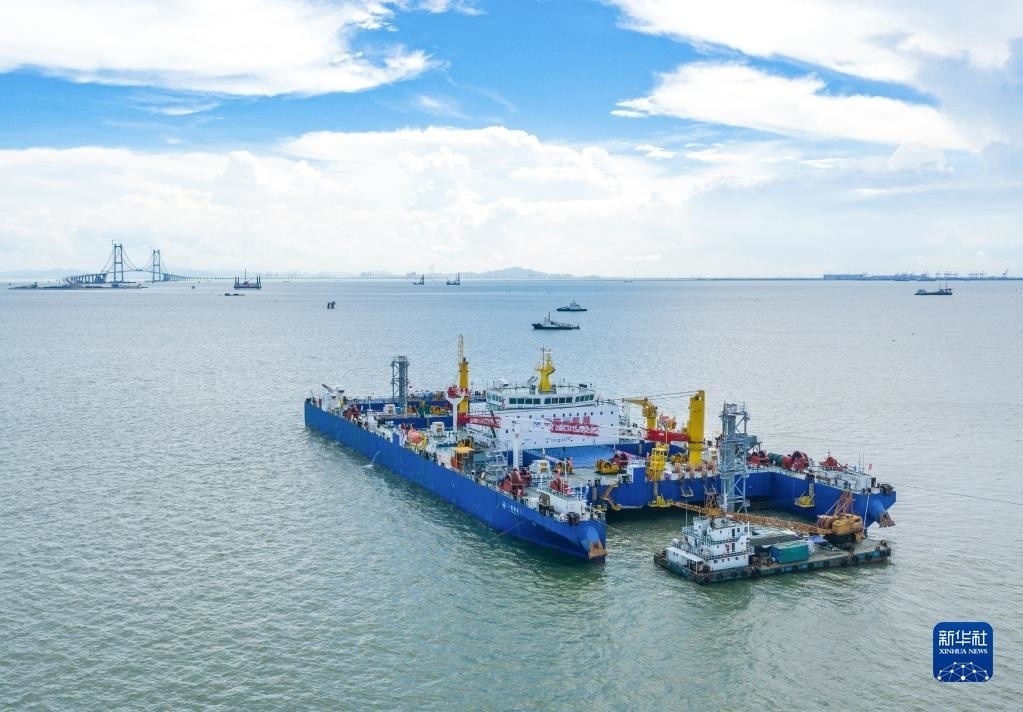 “一航津安1”號(hào)沉管運(yùn)輸安裝一體船在沉放安裝E23管節(jié)和最終接頭,背后是建設(shè)中的深中通道伶仃洋大橋(6月9日攝,無人機(jī)照片)。   新華社發(fā)