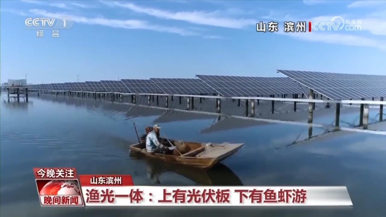 我們現(xiàn)在從陸地轉(zhuǎn)向水域,在山東濱州沾化的這個(gè)鹽田蝦養(yǎng)殖區(qū)里,蝦池上方是藍(lán)色光伏板,25度傾斜角的設(shè)計(jì),既能達(dá)到最佳發(fā)電效果,又能為蝦池遮光、降溫。光伏矩陣下,漁民撐一葉小舟為蝦苗投喂餌料。每年,2000萬尾鹽田蝦從這里游上全國餐桌,近4億度清潔綠電并入電網(wǎng)。養(yǎng)殖業(yè)牽手新能源,奏出新時(shí)代的漁光曲。