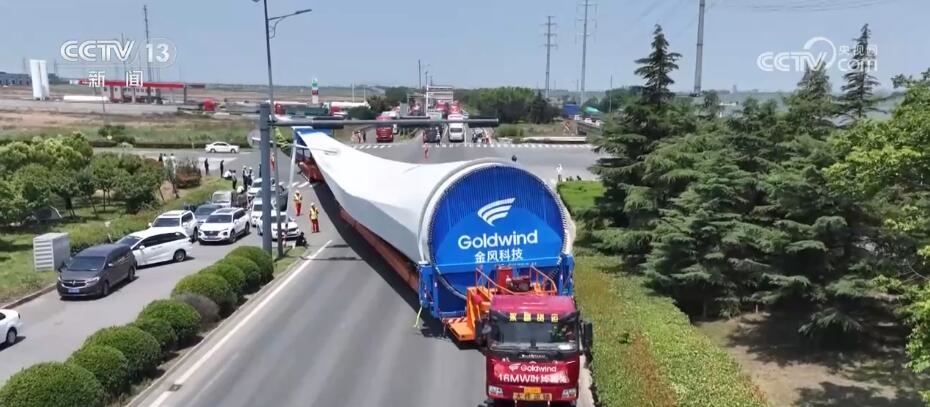 央視網(wǎng)消息:今天(6月14日)上午,100%我國自主知識產(chǎn)權(quán)的123米超長海上風(fēng)電葉片在江蘇連云港啟動陸地轉(zhuǎn)運工作。上午9時,代表著我國風(fēng)電裝備最新技術(shù)水準的大葉片,從廠區(qū)到港口碼頭,陸地運輸全程約30公里,耗時約3到4個小時,其中運輸大葉片的車輛還要拐過90度的直角彎。如此大體量的裝備運輸是一個復(fù)雜的過程,其中有哪些技術(shù)難點?來看記者今天上午從現(xiàn)場發(fā)回的報道。