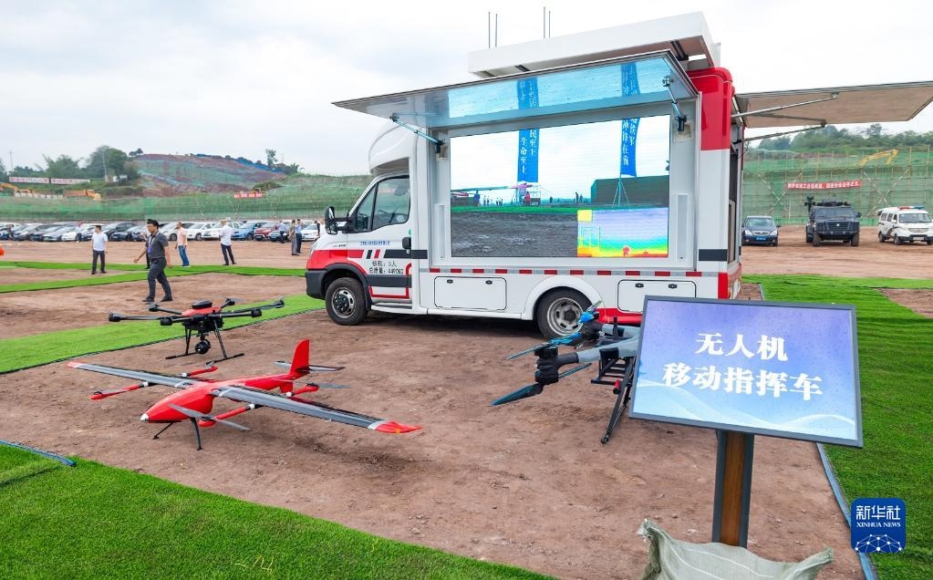這是演練現(xiàn)場展示的無人機(jī)移動指揮車(6月14日攝)。