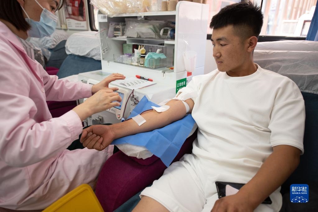 6月14日,市民在寧夏銀川市新華街愛(ài)心獻(xiàn)血車內(nèi)獻(xiàn)血。