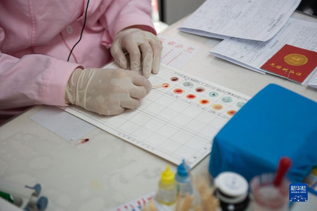 6月14日,在寧夏銀川市新華街愛(ài)心獻(xiàn)血車內(nèi),醫(yī)務(wù)人員為獻(xiàn)血者進(jìn)行血樣檢測(cè)。