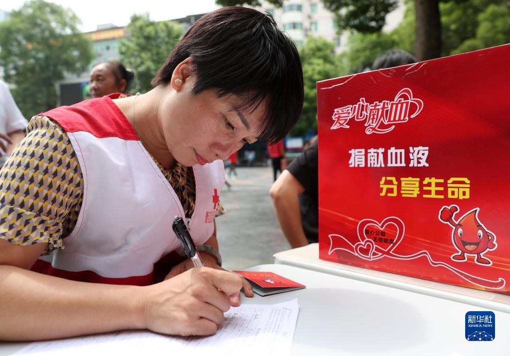 6月14日,志愿者在重慶市黔江區(qū)獻(xiàn)血愛(ài)心屋填寫無(wú)償獻(xiàn)血信息。