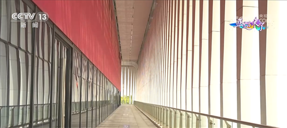 總臺央視記者 任梅梅:現(xiàn)在我們就來到了手球館室外的二層平臺,進入了“水幔”的內(nèi)部,這一條條垂著的“水?!逼鋵嵅粌H僅是裝飾品,更有著實際的作用,它們就像百葉窗一樣,能夠起到隔熱的效果,另外還可以減少眩光,提高室內(nèi)視覺的舒適度。