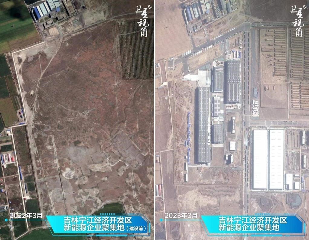 ↑2023年與2022年相比,吉林寧江經(jīng)濟(jì)開發(fā)區(qū)的一片空地建設(shè)成頗具規(guī)模的新能源企業(yè)聚集地。