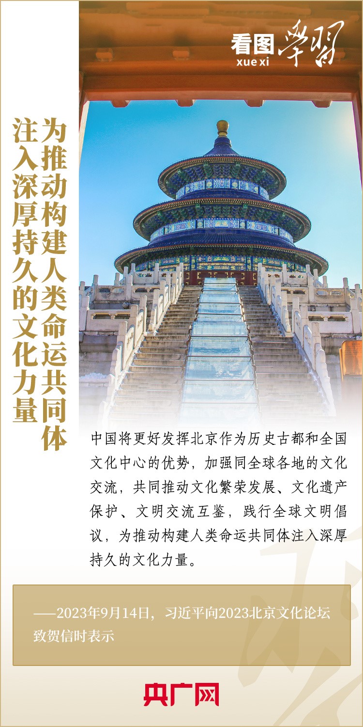 9月14日,以“傳承優(yōu)秀文化 促進(jìn)交流合作”為年度主題的2023北京文化論壇在北京開幕。習(xí)近平主席向論壇致賀信表示,中國將更好發(fā)揮北京作為歷史古都和全國文化中心的優(yōu)勢,加強(qiáng)同全球各地的文化交流,共同推動(dòng)文化繁榮發(fā)展、文化遺產(chǎn)保護(hù)、文明交流互鑒,踐行全球文明倡議,為推動(dòng)構(gòu)建人類命運(yùn)共同體注入深厚持久的文化力量。