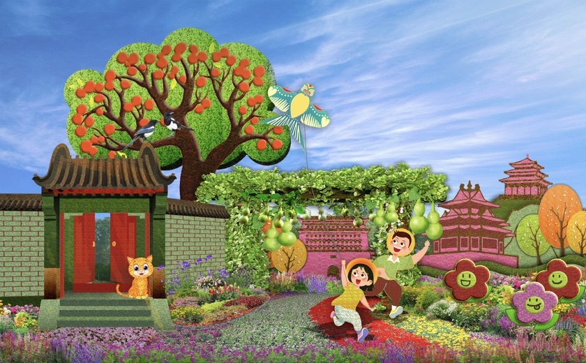 4,東單西北角的“和諧共生”花壇頂高8.5米,“三北工程”綠色長(zhǎng)城為主景,配以野馬(西北)、麋鹿(華北)、白鶴(東北)、胡楊等典型物種,體現(xiàn)了生態(tài)治理的典范,寓意堅(jiān)定不移走好人與自然和諧共生的中國式現(xiàn)代化之路。