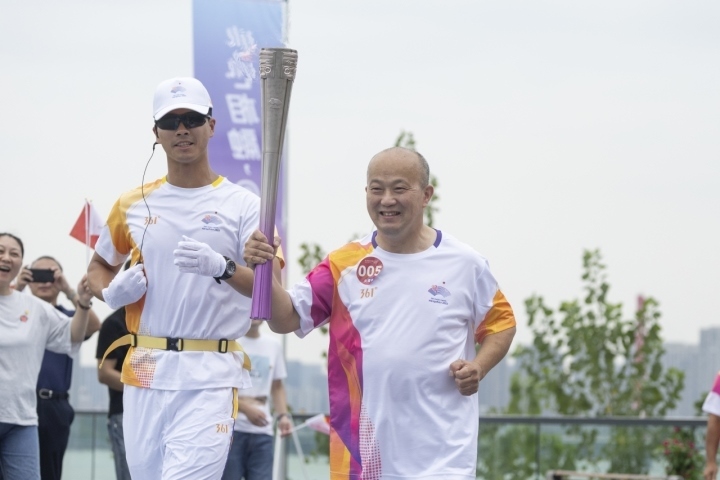 第1棒火炬手陳雨菲和第二棒火炬手、西湖大學校長施一公進行火炬交接